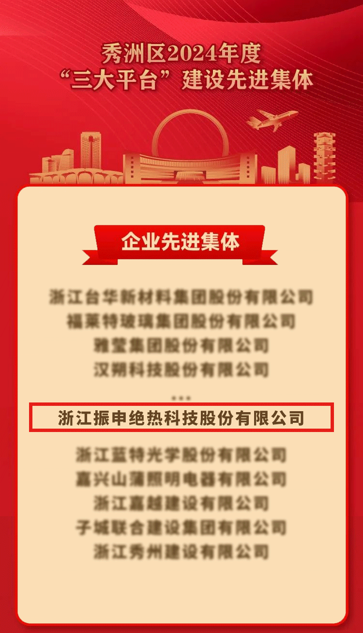 會(huì)議通報(bào)了2024年度全區(qū)綜合考核結(jié)果,一批企業(yè)和單位受到表彰表?yè)P(yáng)。在本次大會(huì)上,振申絕熱憑借其在絕熱領(lǐng)域的卓越表現(xiàn),榮獲秀洲區(qū)2024年度“企業(yè)先進(jìn)集體”稱(chēng)號(hào)。